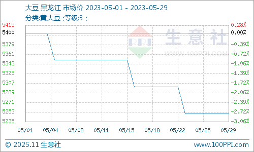 据生意社监测数据显示:5月15日开始,国产大豆行情持续弱势下行,跌幅接近2%。5月15日,国产大豆市场均价5350元/吨,5月29日,国产大豆市场均价5250元/吨,价格下跌1.87%。