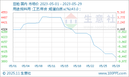 据生意商品行情分析系统数据显示:5月,国内豆粕行情高台跳水,整体下跌8.7%。月初,豆粕市场均价4324元/吨,5月29日,豆粕市场均价3948元/吨,价格下跌8.7%。
