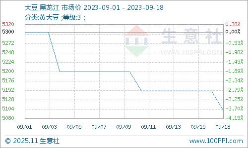 据生意社监测数据显示:9月开始,国产大豆行情弱势下行,跌幅接近4%。9月1日,国产大豆市场均价5300元/吨,9月18日,国产大豆市场均价5100元/吨,下跌3.77%。