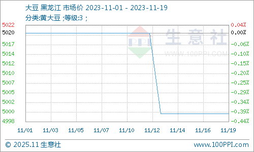 据生意社商品分析系统显示:11月以来,国产大豆行情小幅下跌,行情弱势运行。月初,国产大豆市场均价5020元/吨,19日,国产大豆市场均价5000元/吨,跌幅0.4%。