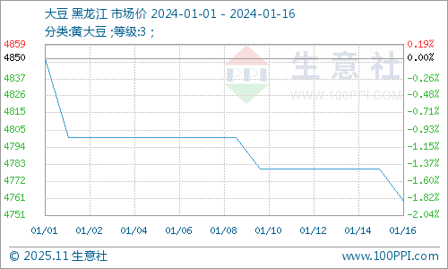 据生意社商品行情分析系统显示:元旦过后,国产大豆行情不断下滑,价格继续走低。1月1日,国产大豆市场均价4850元/吨,1月16日,国产大豆市场均价4760元/吨,价格下跌1.86%。